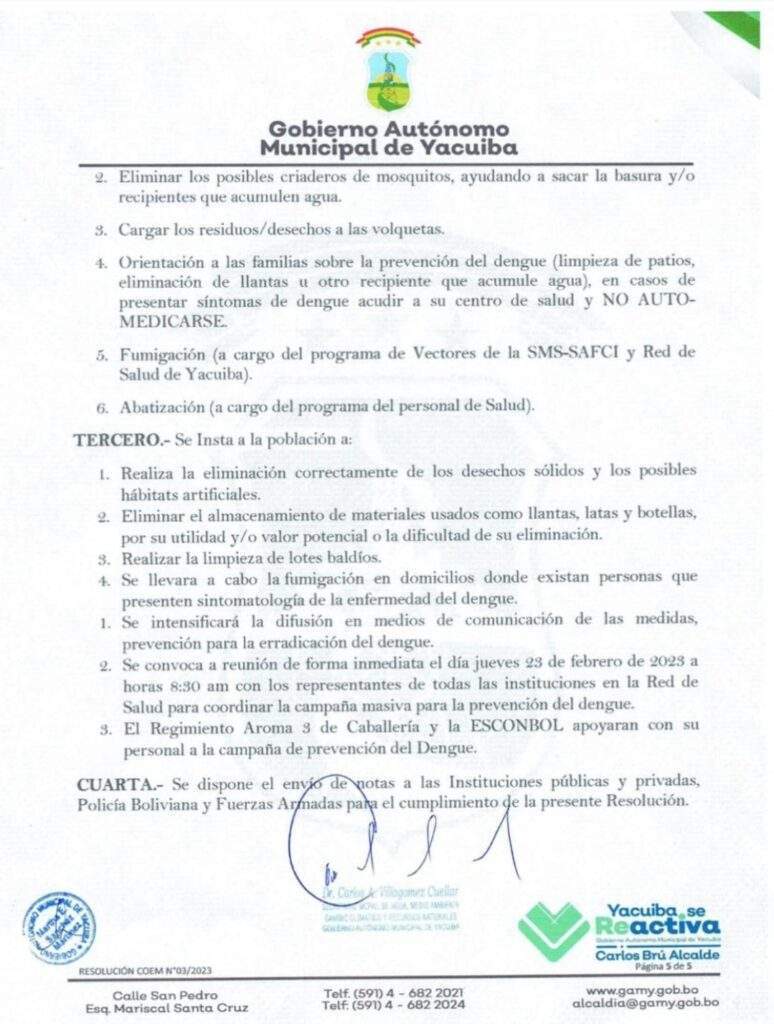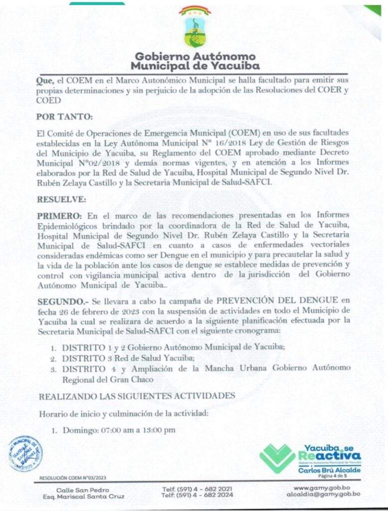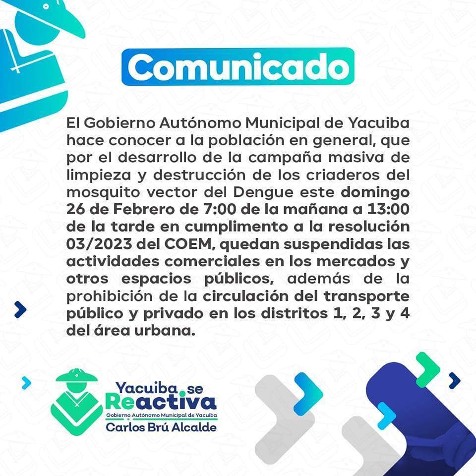 Mediante comunicado emitido después del medio día del sábado 25 de febrero el Gobierno Municipal anunció detalles de la campaña masiva de limpieza y eliminación de criaderos, así mismo también establece la prohibición de circulación del transporte público y privado en los Distritos 1,2,3, y 4 del municipio de Yacuiba .